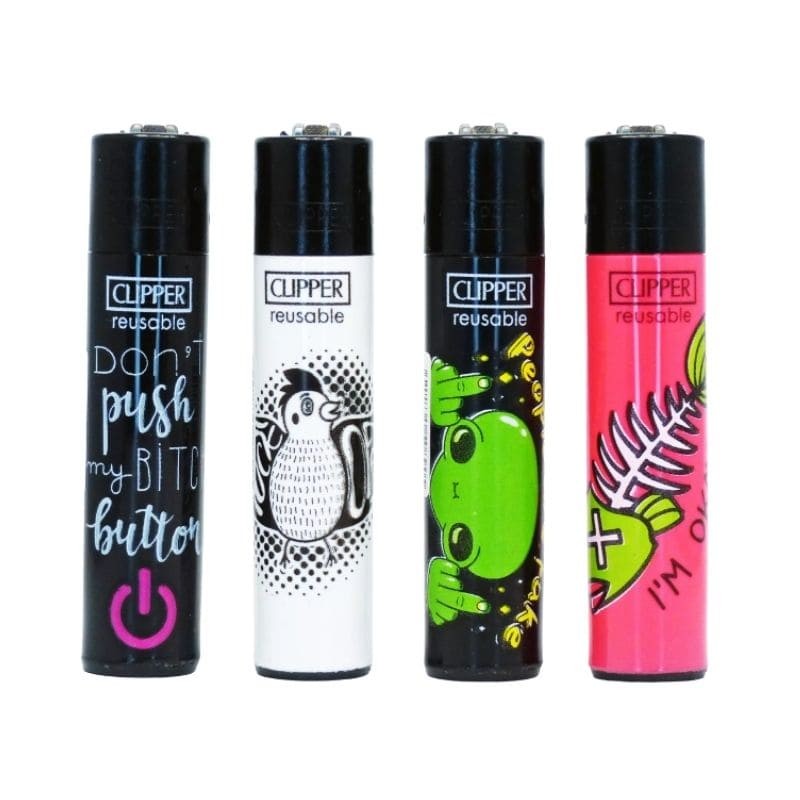 Entre le bouton “Don’t push my bitch button”, le piaf insolent, la grenouille qui t’envoie balader et le poisson os qui s’affiche, chaque briquet est une vraie punchline visuelle. Comme toujours avec Clipper, ils sont rechargeables, durables et équipés de pierre et molette remplaçables.