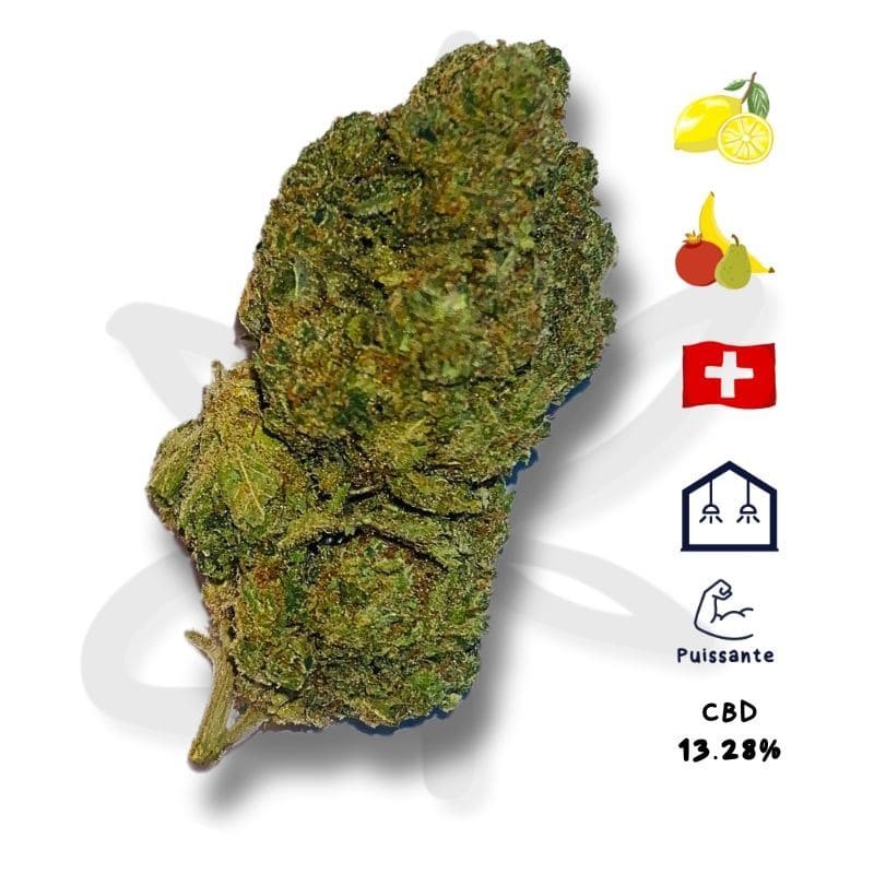 Avec ses arômes sucrés et fruités, son taux de CBD de 13,28 %, et une culture soignée indoor suisse, cette variété te promet une expérience unique.
